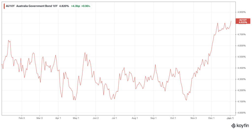 The Australian ten year bond yield has already had a marked increase from 4.11% in October just before the CPI announcement, to hit a peak of 4.82% as we go to print with this update.