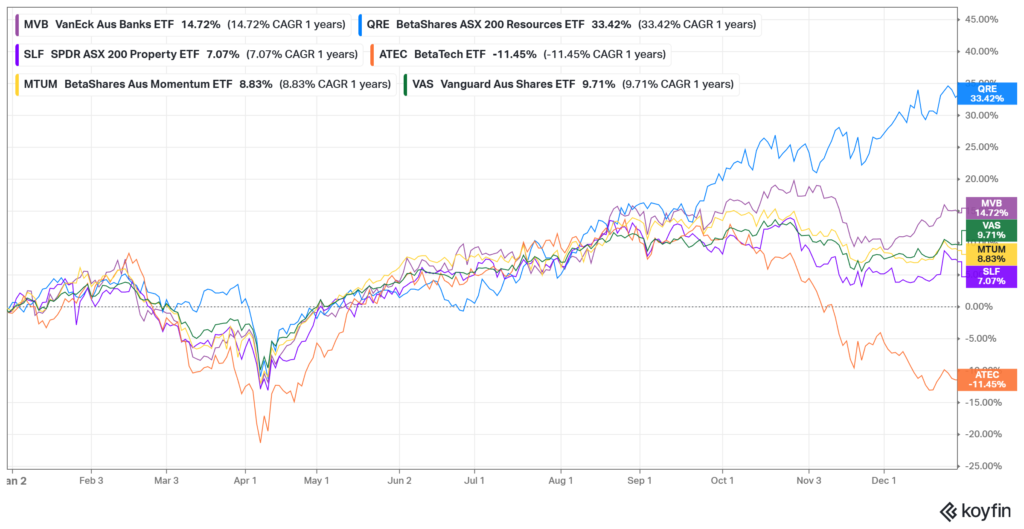 As can be seen, all sectors were selling off together into the Trump Tariff Tantrum in March. Then from early April they all rose together until September. Then there was a real divergence with Materials continuing much higher, while Australian Technology stocks took a dive, finishing down 11.45% over the year.