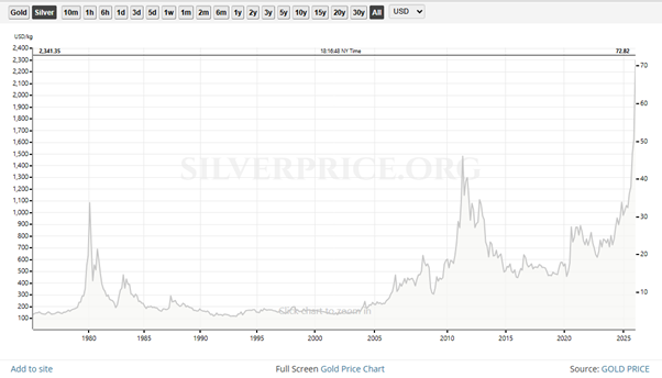 Investors should be cautious when an asset goes parabolic, as silver and gold have recently. No doubt the metals have benefited from the rising distrust in government ‘paper’. The rise in long term interest rates is the evidence that market participants are demanding a higher rate of return on long term bonds to compensate for the risk that inflation stays higher for longer and that governments keep the money printers whirring. There is also a lot more demand from sovereign nations who prefer the idea of holding a universal currency (gold) that is not controlled by the USA. However, some historical context may be helpful when contemplating an investment in silver, or gold for that matter. The chart below shows the silver price and the two previous big spikes following the inflation of the 70’s and the GFC aftermath in 2009-2011.